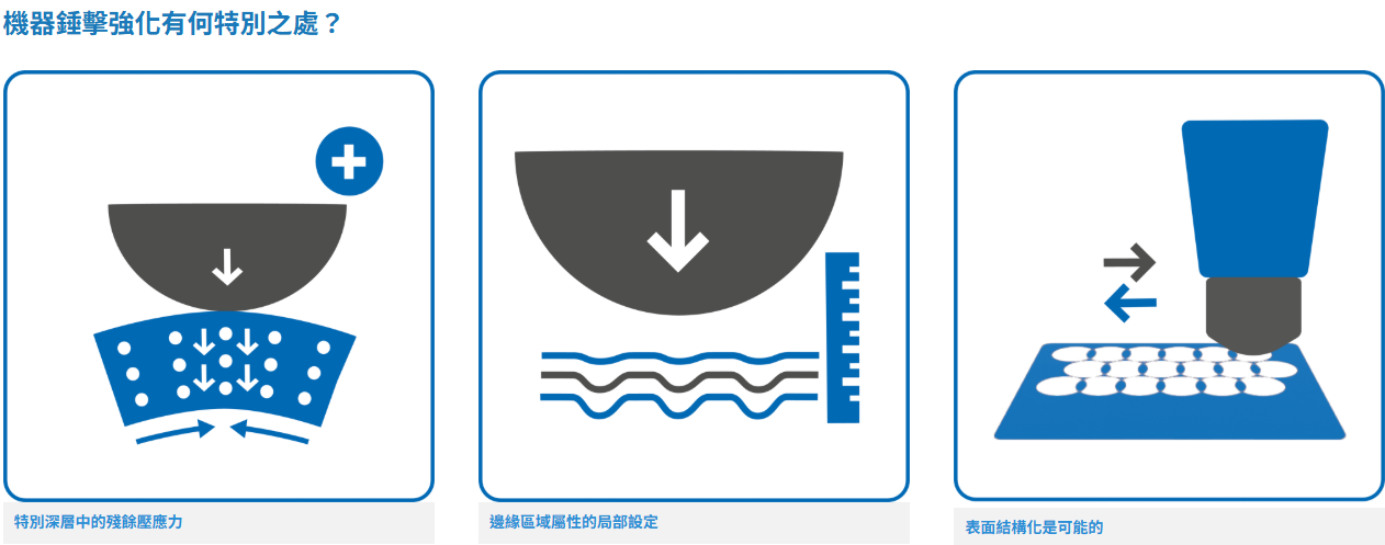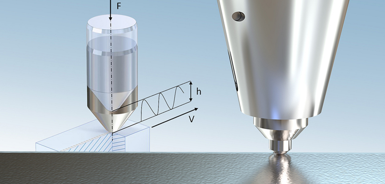 顧名思義,機械錘擊強化 (MHP) 是一種使用機器引導工具進行的脈衝機械表面處理。此工藝介於噴丸強化和深滾壓之間。在噴丸強化中,噴丸顆粒以脈衝方式撞擊表面。然而,該製程實際上不可能整合到CNC工具機中。而深滾壓可以整合到任何CNC工具機中。然而,滾動體始終與表面保持持續接觸。成形速度較低,且沒有脈衝成形。