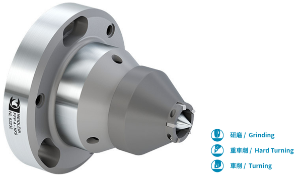 ◦ 運作原理: 採用雙動力操作。工件定心於固定的頂針上,驅動盤則由主軸側的夾持油缸獨立推出